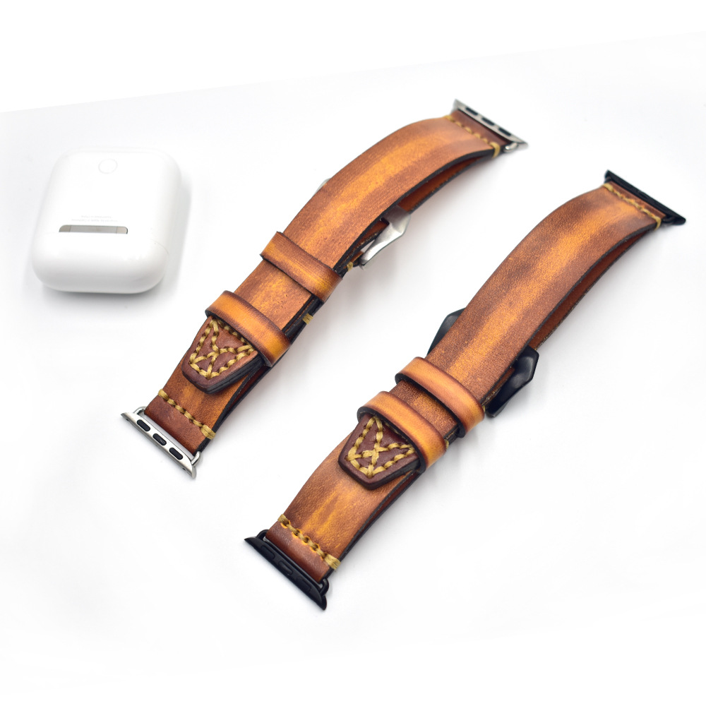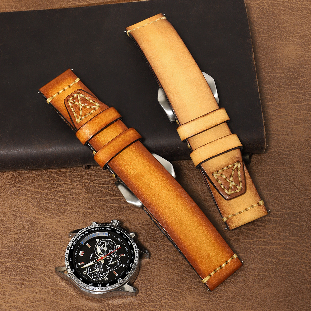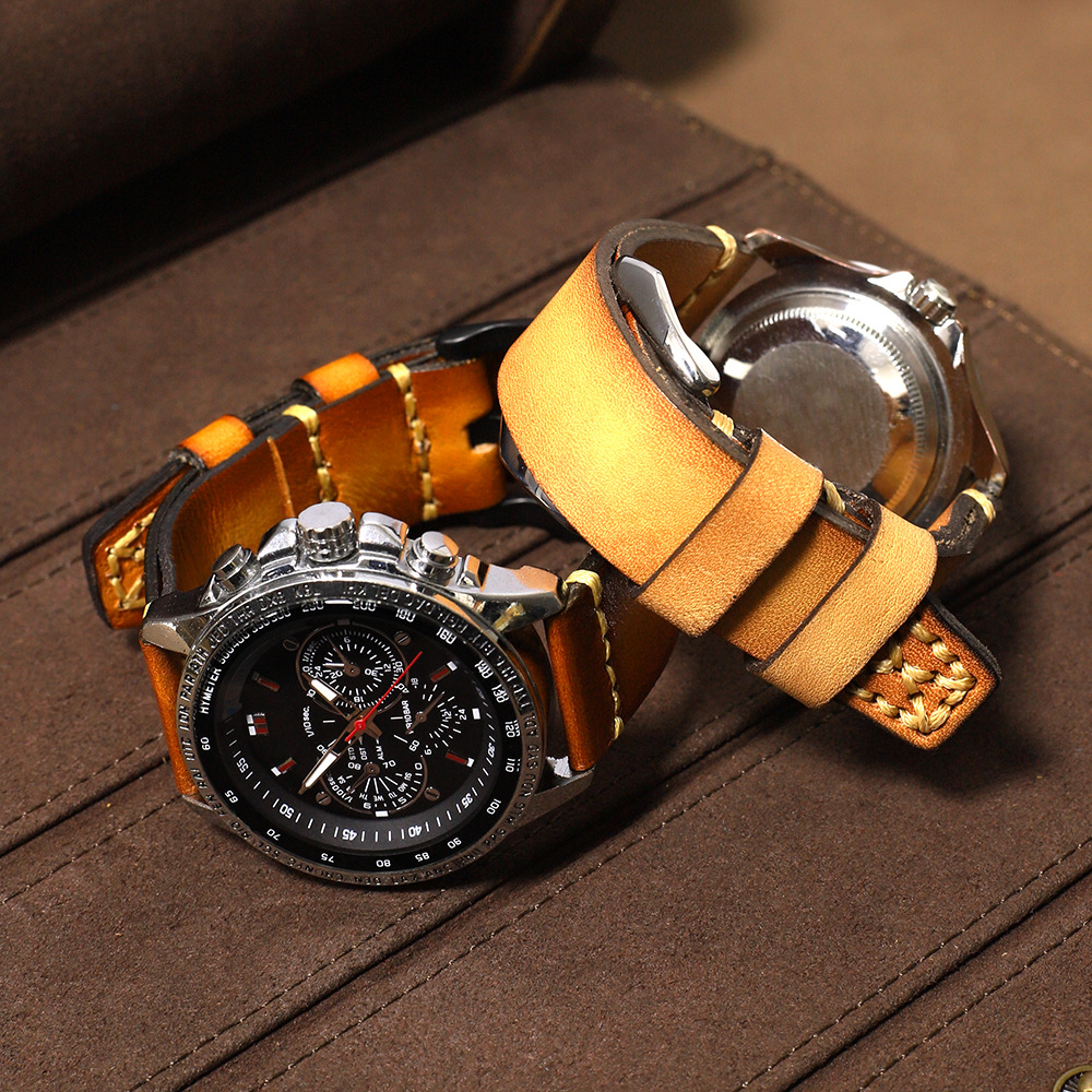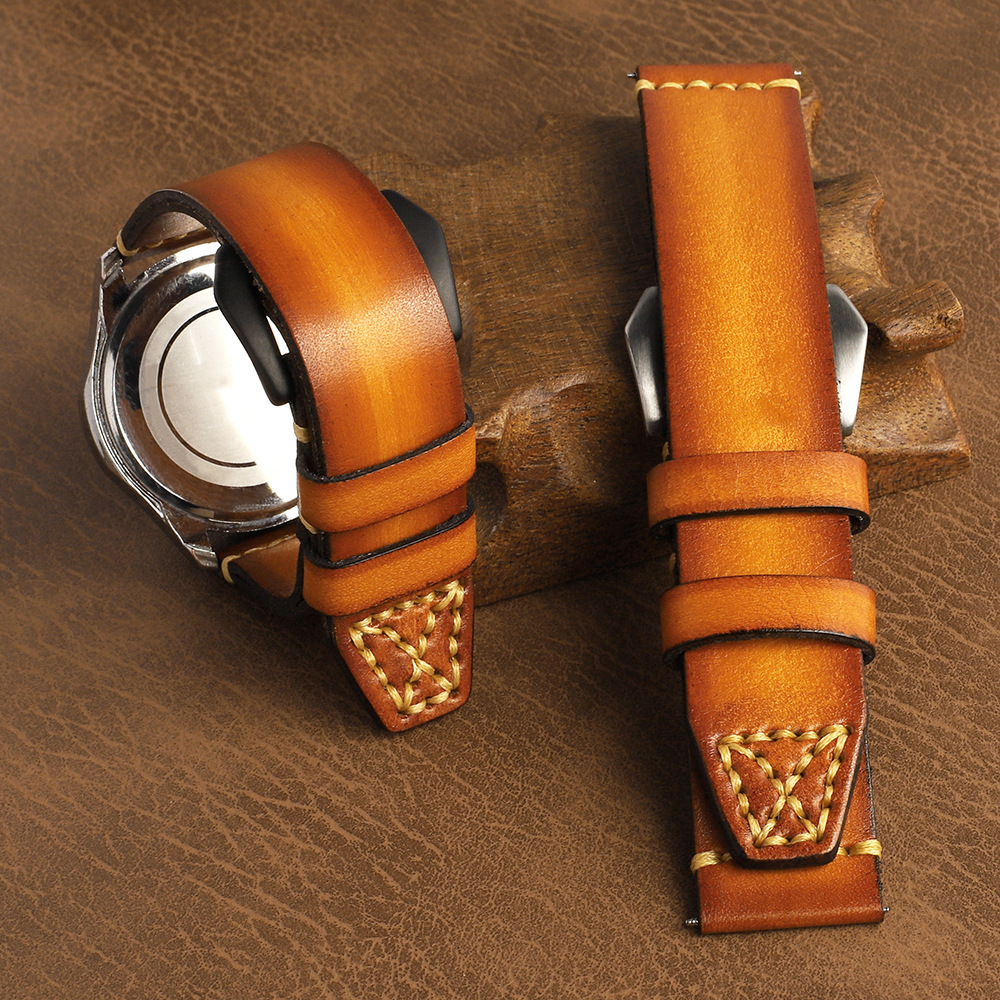 熟練職人による手縫いステッチが際立つ、本格派の腕時計ベルトです。革の風合いを活かした仕上げで、使い込むほどに味わい深い経年変化をお楽しみいただけます。
